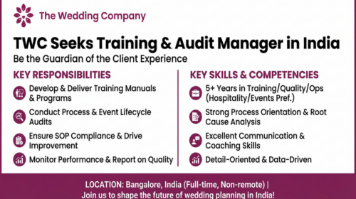 The Wedding Company (TWC), India’s rapidly scaling, tech-enabled wedding planning platform, is looking for a Training & Audit Manager to ensure every single client experience meets our premium standards.